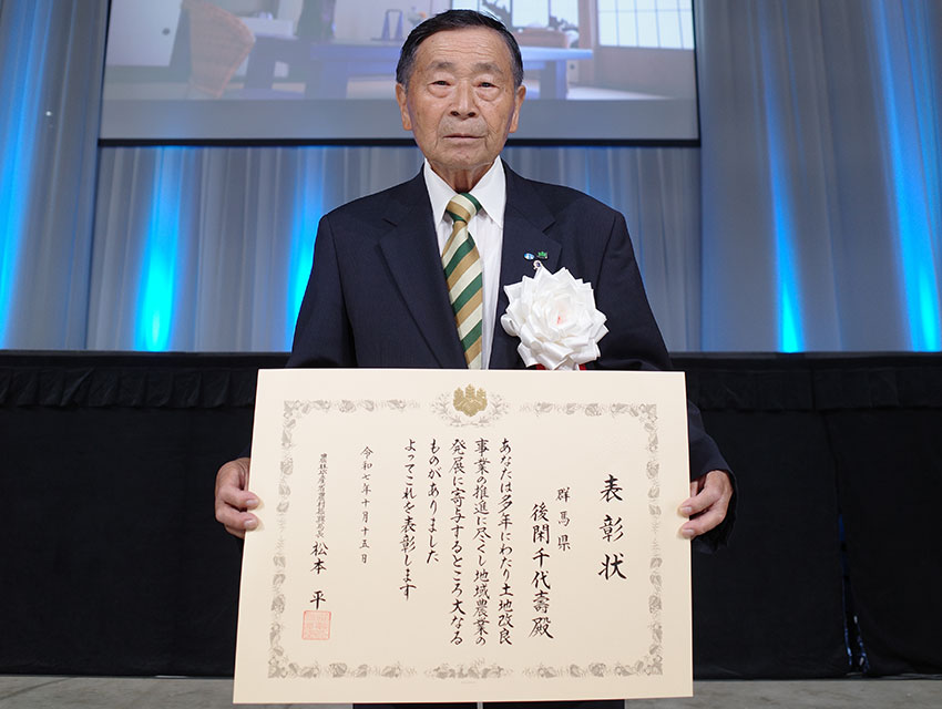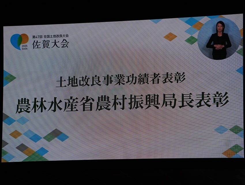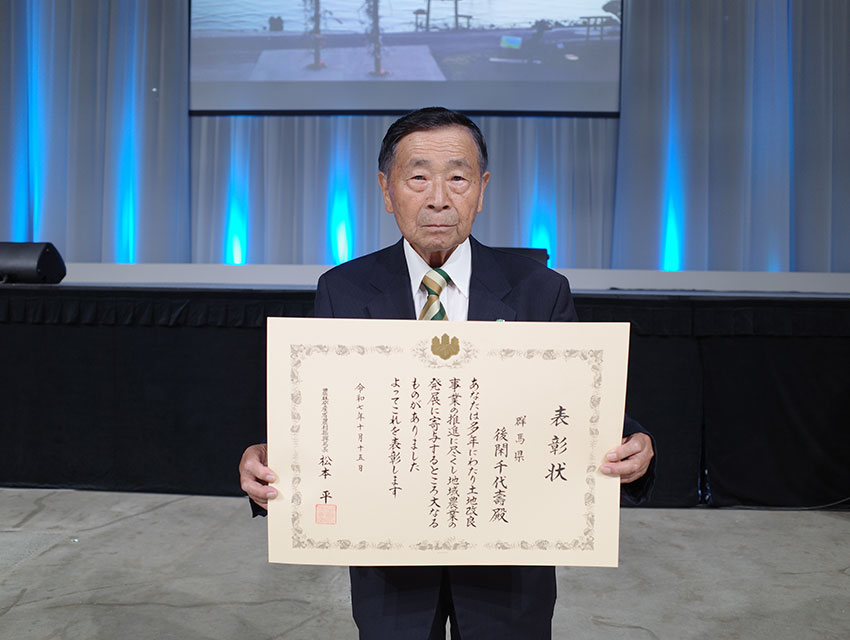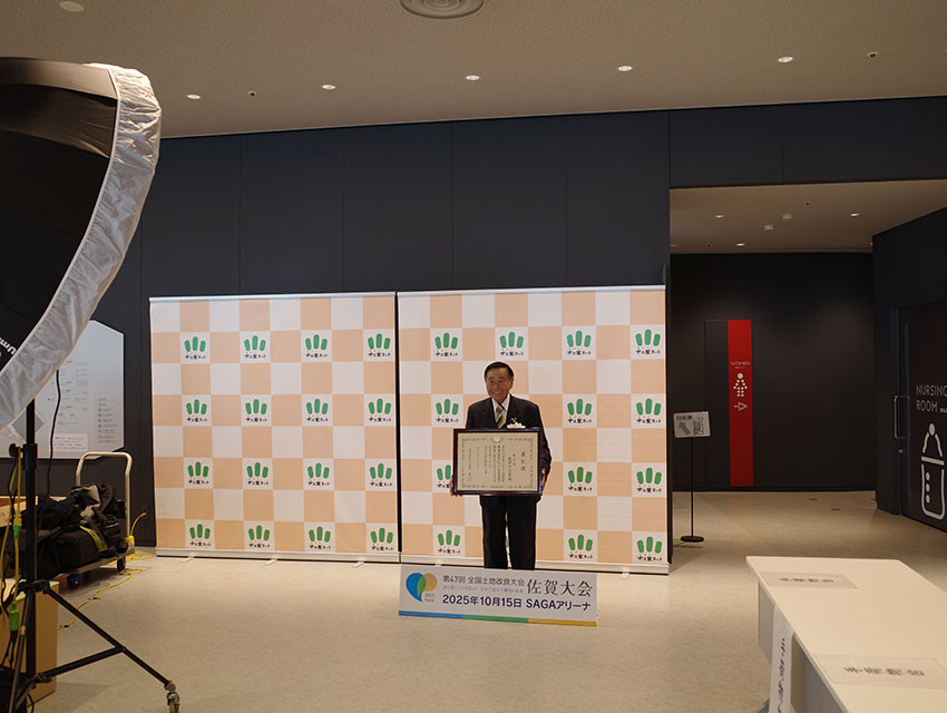 令和7年10月15日に開催された「第47回全国土地改良大会佐賀大会」において、これまでの土地改良事業への功績が認められ、令和7年度土地改良事業功労者表彰(農村振興局長表彰)」を後閑理事長が受けました。